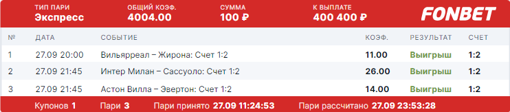 Клиент букмекерской конторы Fonbet смог угадать точный счет в трех футбольных матчах, проходивших 27 сентября. В каждом из трех событий ставка была сделана на одинаковый счет – 1:2. Несмотря на небольшое количество матчей в экспрессе, за счет довольно высоких коэффициентов итоговый индекс получился внушительным – 4004,00.
