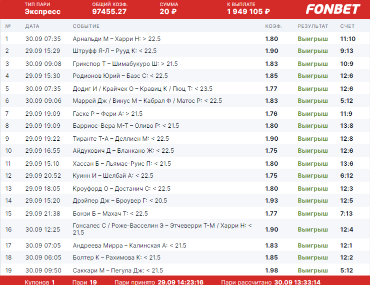 Для этого он собрал экспресс из 19 событий из мира тенниса, проходивших 29 и 30 сентября. Минимальный коэффициент в купоне составлял 1,75, а максимальный достигал 1,98. Но за счет количества выбранных событий общий индекс в экспрессе составил аж 97 455,27. Клиент поставил всего 20 рублей и получил без малого два миллиона рублей, когда все его прогнозы оказались верными.