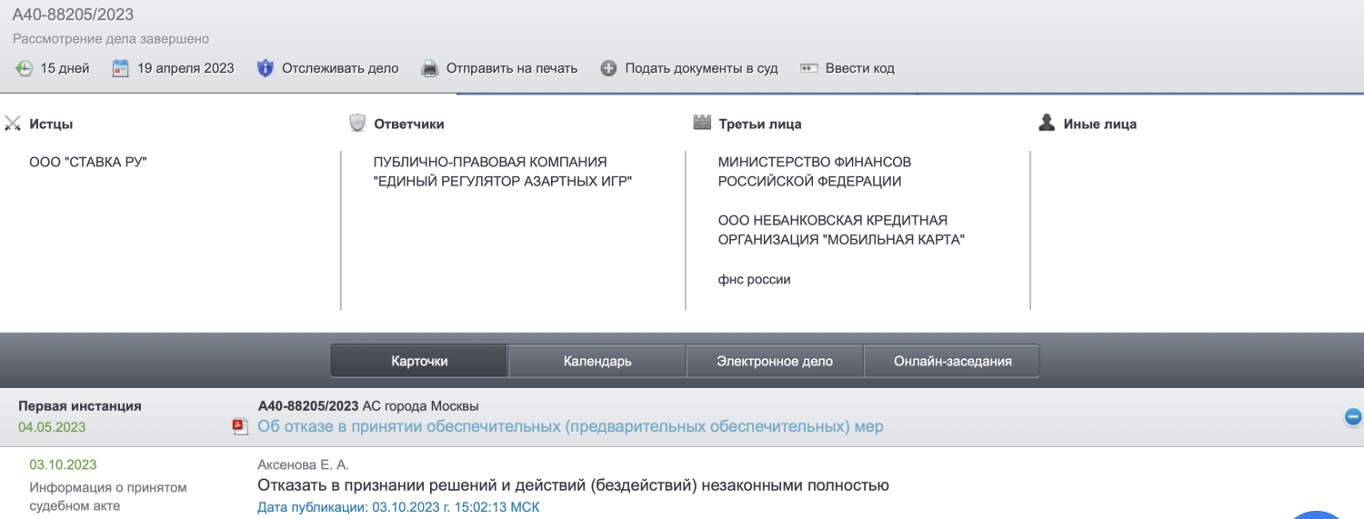 Напомним, иск ООО «Ставка Ру» против ППК ЕРАИ находился на рассмотрении Арбитражного суда г. Москвы с 19 апреля 2023 года. «1хСтавка» требовала отменить решение ЕРАИ по ограничению присоединения к информационной системе. На текущий момент ООО «Ставка Ру» является истцом сразу в пяти судебных разбирательствах, включая два дела против НКО «Мобильная карта».