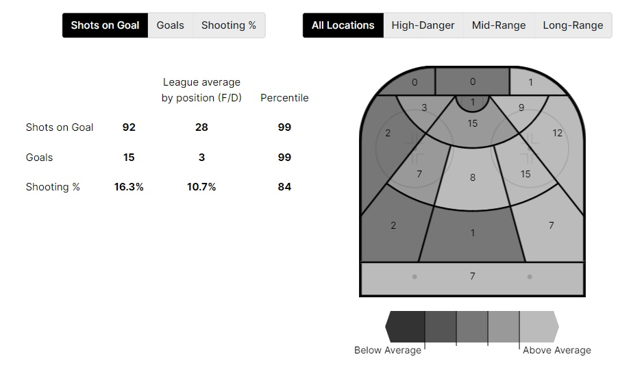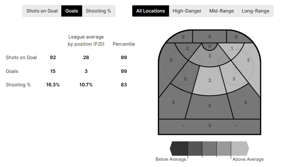 А теперь взглянем на карту точных попаданий. Как и полагается элитному правому вингеру, все они пришлись на правый фланг атаки – причем больше всего шайб пришлось именно на самую крайнюю часть площадки.
