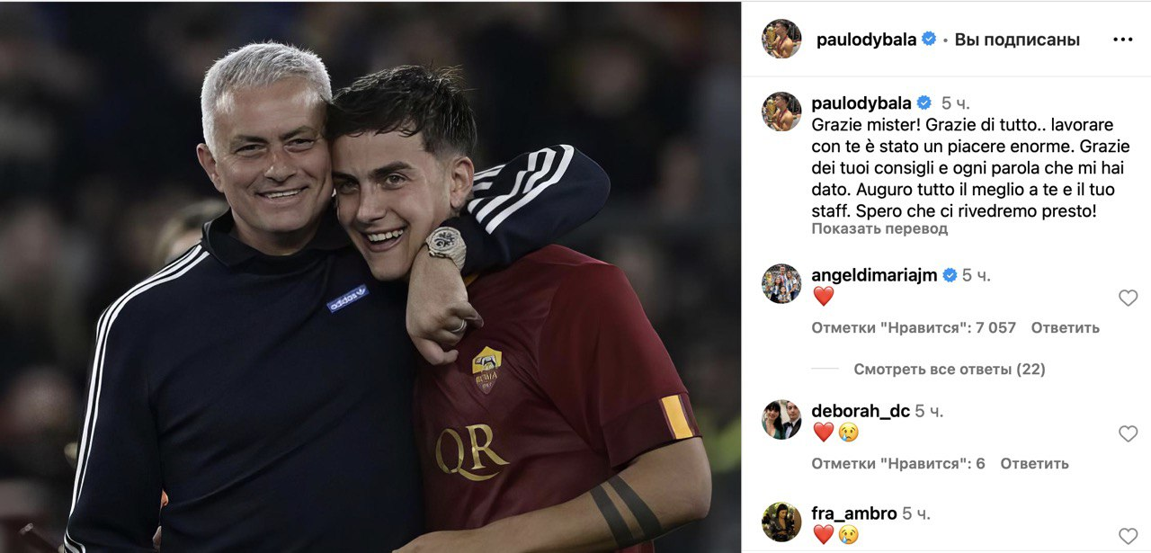 Важна и реакция футболистов. Например, один из самых важных креативных игроков «Ромы» Пауло Дибала тепло попрощался с Моуринью в соцсетях. Аргентинец сказал большое спасибо Жозе за работу, советы и подсказки, которые от него получил. Также Дибала отметил, что для него было большим удовольствием работать с Моуринью и что он надеется на скорую встречу с португальцем.