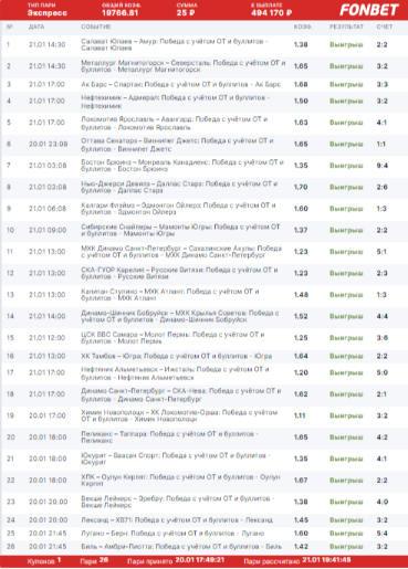 При этом человек отказался от рискованных прогнозов. Во всех событиях кэф не превышал 1,70. При этом он всегда выбирал ставку на фаворита с учётом возможного овертайма или серии буллитов.