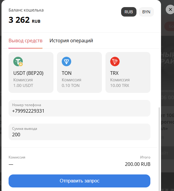 !! Обратите внимание списание будет происходить в выбранной валюте (RUB или BYN) независимо от способа вывода.