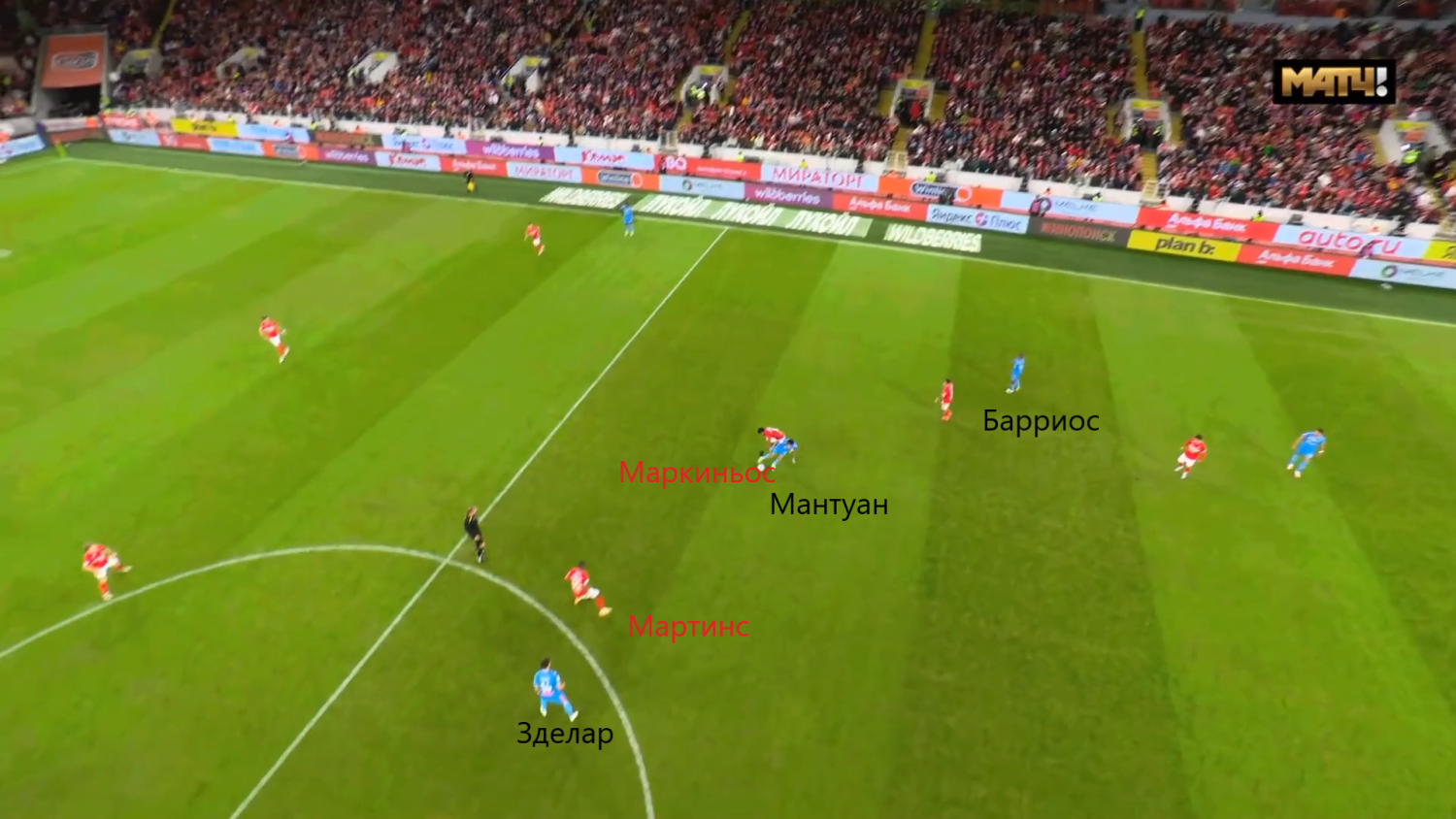 В первом тайме тактика «сине-бело-голубых», в принципе, работала. Явных моментов не было ни у одной из команд. Однако в самом конце план «красно-белых» дал свои плоды: Маркиньос запрессинговал Мантуана, а Мартинс подобрал мяч и прошел с ним почти до штрафной «Зенита», откуда и забил свой мяч после удара.