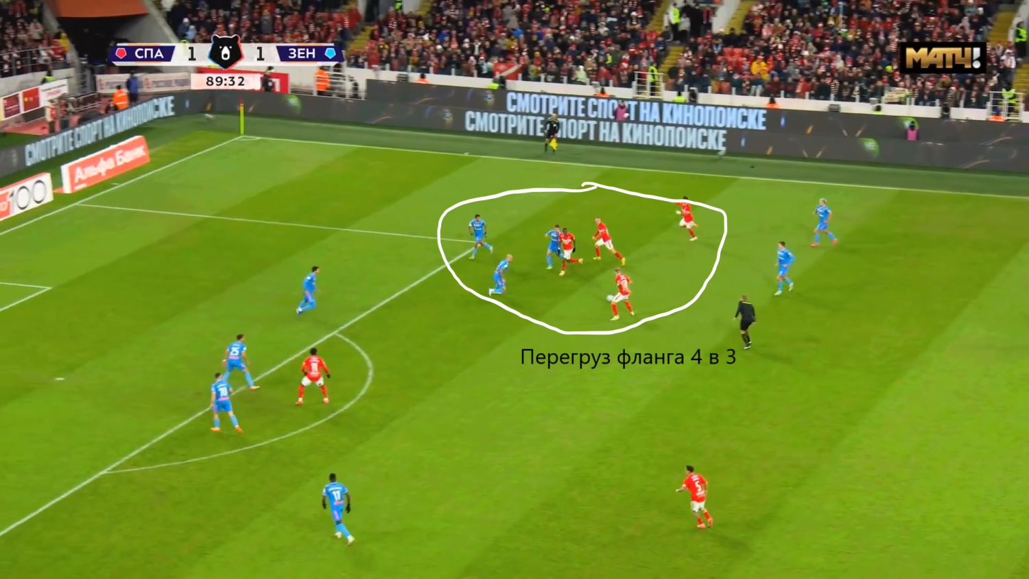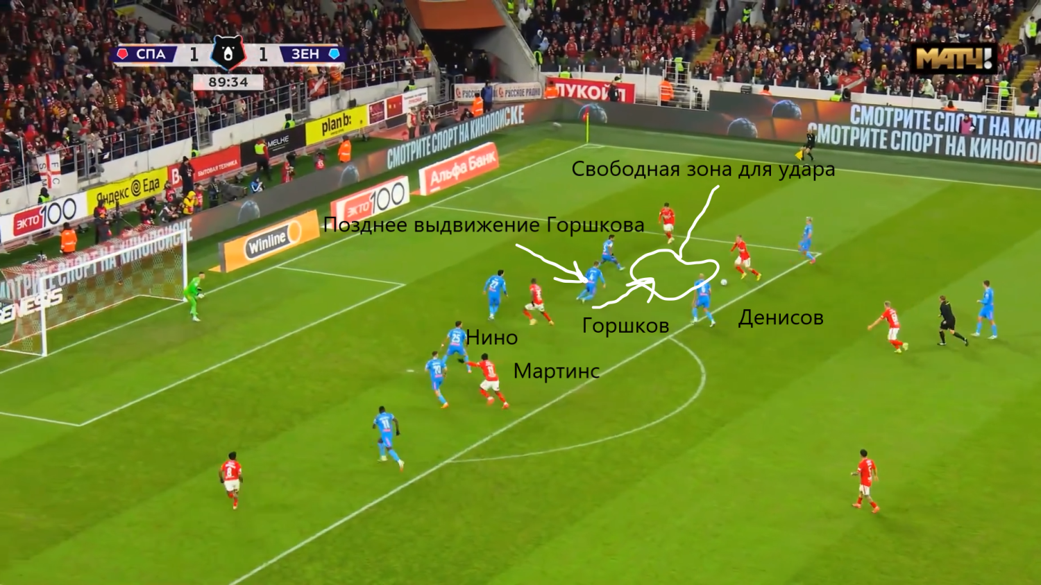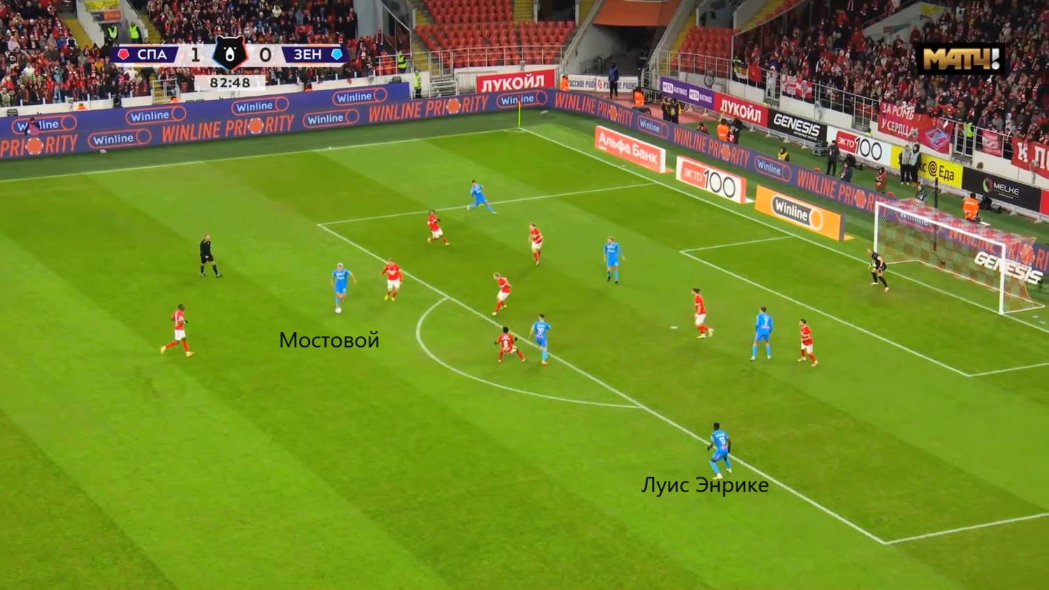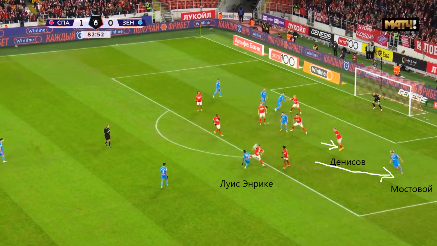Также важно отметить, как Мостовой увёл за собой Денисова, ворвавшись в штрафную после передачи.