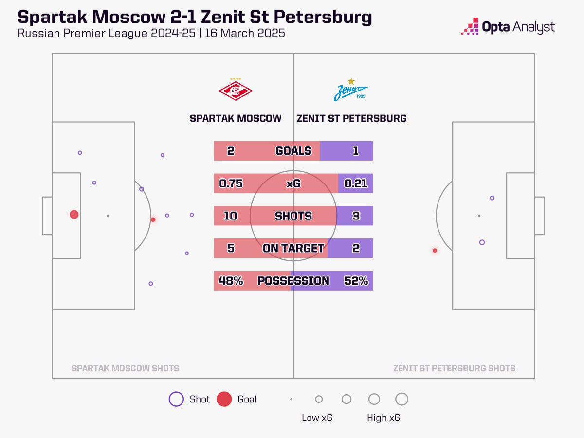 Можно также обратить внимание на статистику, по которой видно, что в атаке у питерцев всё крайне плохо: последний раз команда Семака наносила лишь три удара в 2019 году против «Ростова». Плюс, стоит выделить Мартинса не только по двум забитым мячам. Он также был лучшим в «Спартаке» по ударам (4), касаниям в чужой штрафной (4) и отборам (6).