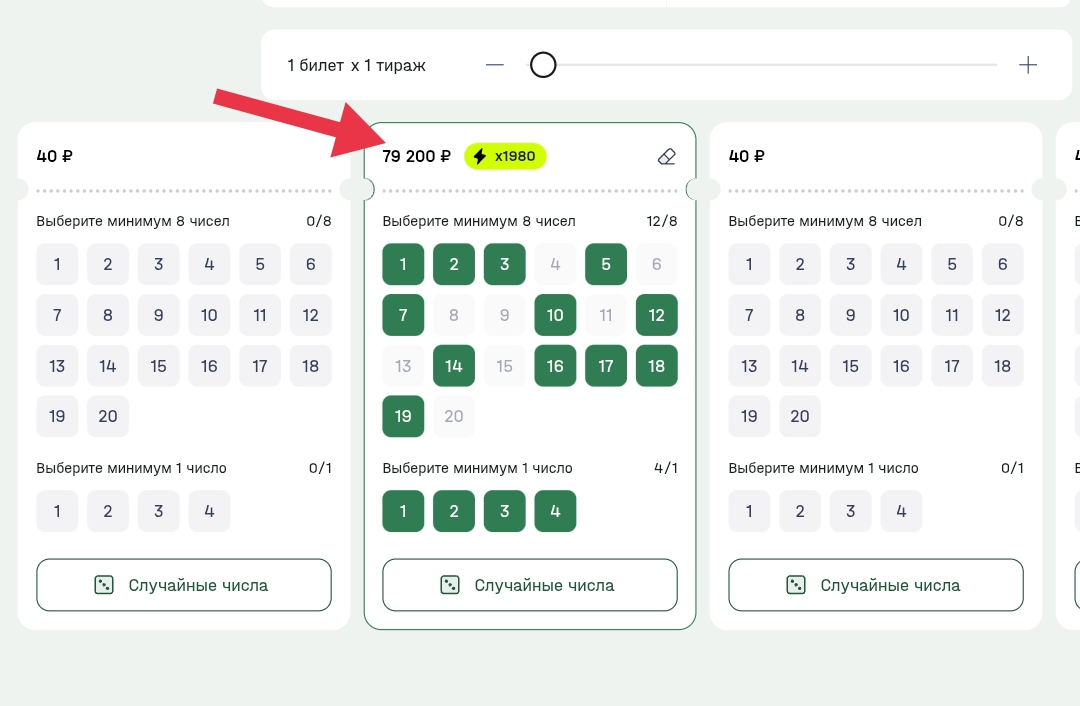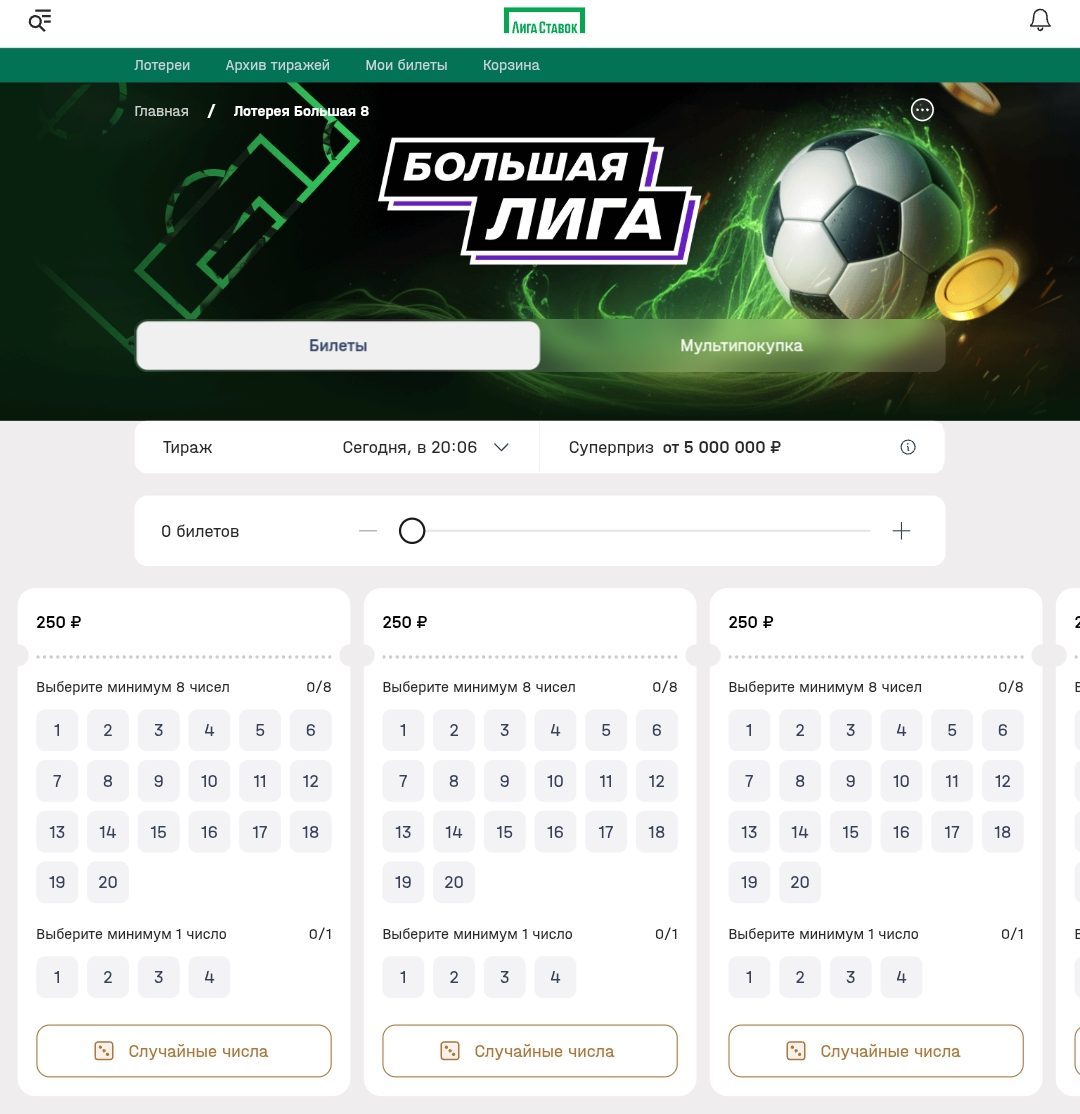 - Гибкость выбора: почти везде можно выбрать числа самому, довериться случайному выбору или использовать функцию «Мультипокупка» (от 5 до 100 билетов сразу).