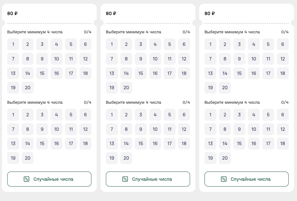 Доступна в «Фонбете», PARI, BetBoom, «Винлайне» и «Лиге Ставок». Числовая лотерея с тремя полями: