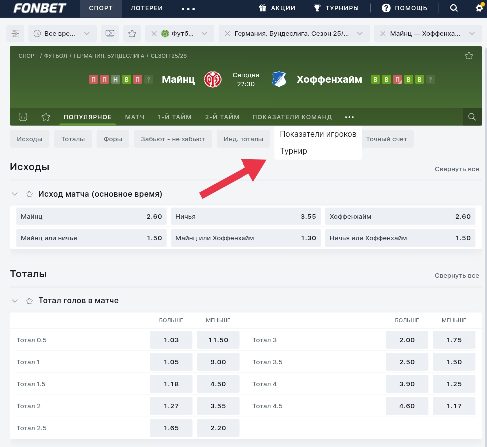 - Акции к турнирам и матчам — предложения под конкретные события;