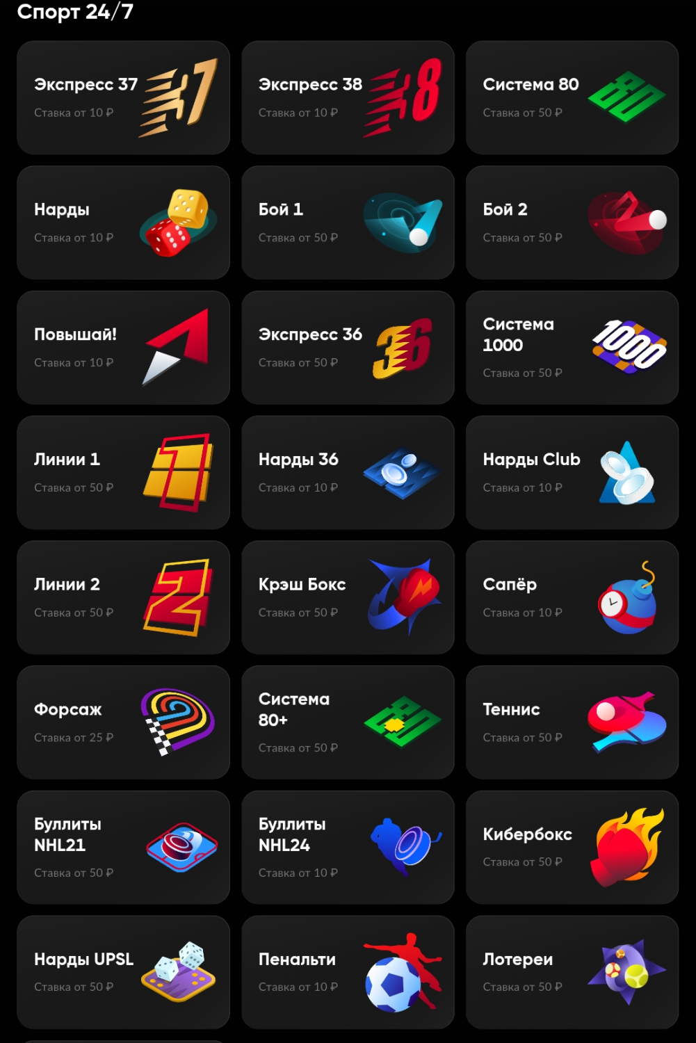 Наиболее широкий выбор быстрых игр среди российских БК представлен у BetBoom. В разделе «Спорт 24/7» доступно более 20 различных форматов.