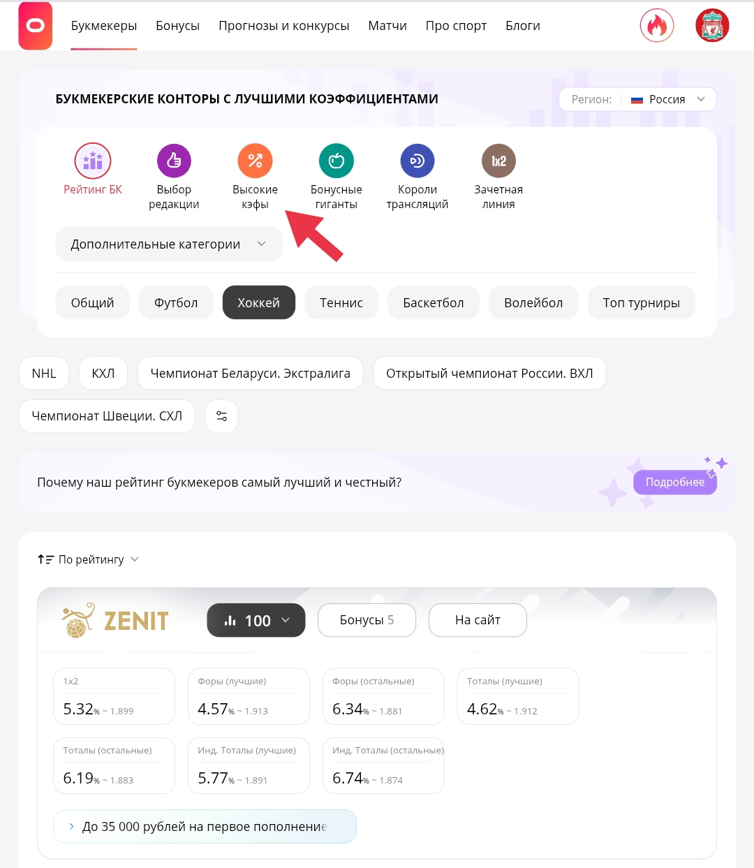 Фильтр удобен тем, что помогает подобрать БК под конкретные предпочтения. Для ставок на футбол и МИР РПЛ на основные исходы часто выбирают «БК Зенит» и «Бет-М». Для хоккея НХЛ и ставок на тоталы выгодные котировки предлагают «Леон» и BetBoom.