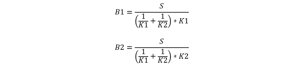 Где B1 – размер первой ставки, В2 – размер второй ставки, S – общая сумма, поставленная на два исхода, К1 – коэффициент первого исхода, К2 – коэффициент второго исхода.