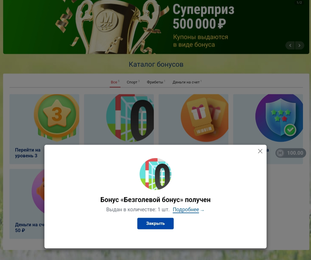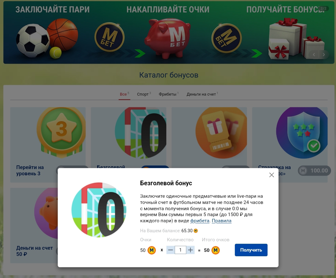 «Безголевой бонус» нужно активировать с помощью очков лояльности. Они начисляются за ставки по программе лояльности, в которой автоматически участвуют все игроки БК «Марафон».