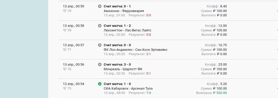 В моем случае ставка на фрибет 100 рублей с коэффициентом 1.82 выиграла, и мне на счет была начислена сумма чистого выигрыша – 82 рубля.