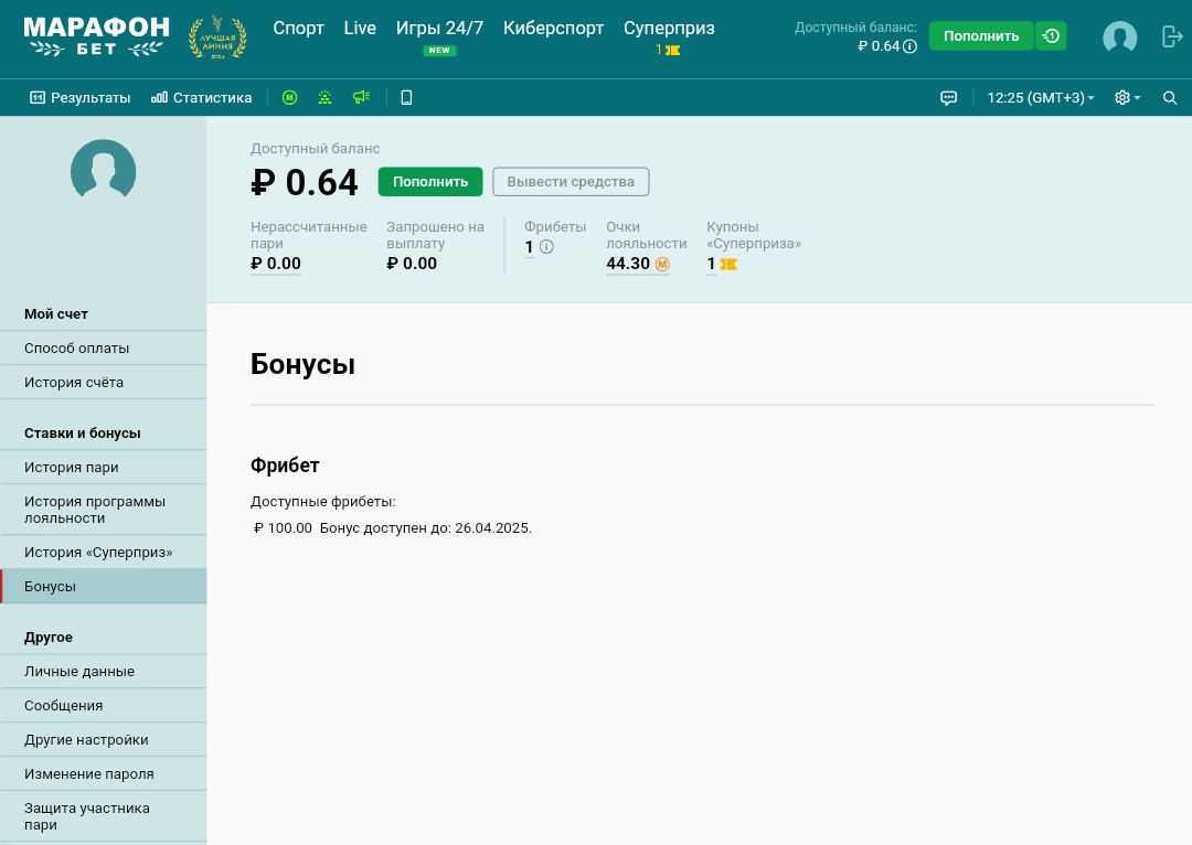 В БК «Марафон» действует акция «Страховка на экспресс», которую можно приобрести за очки программы лояльности. Воспользовавшись данным бонусом, можно застраховать пять «экспрессов» от проигрыша одного события.