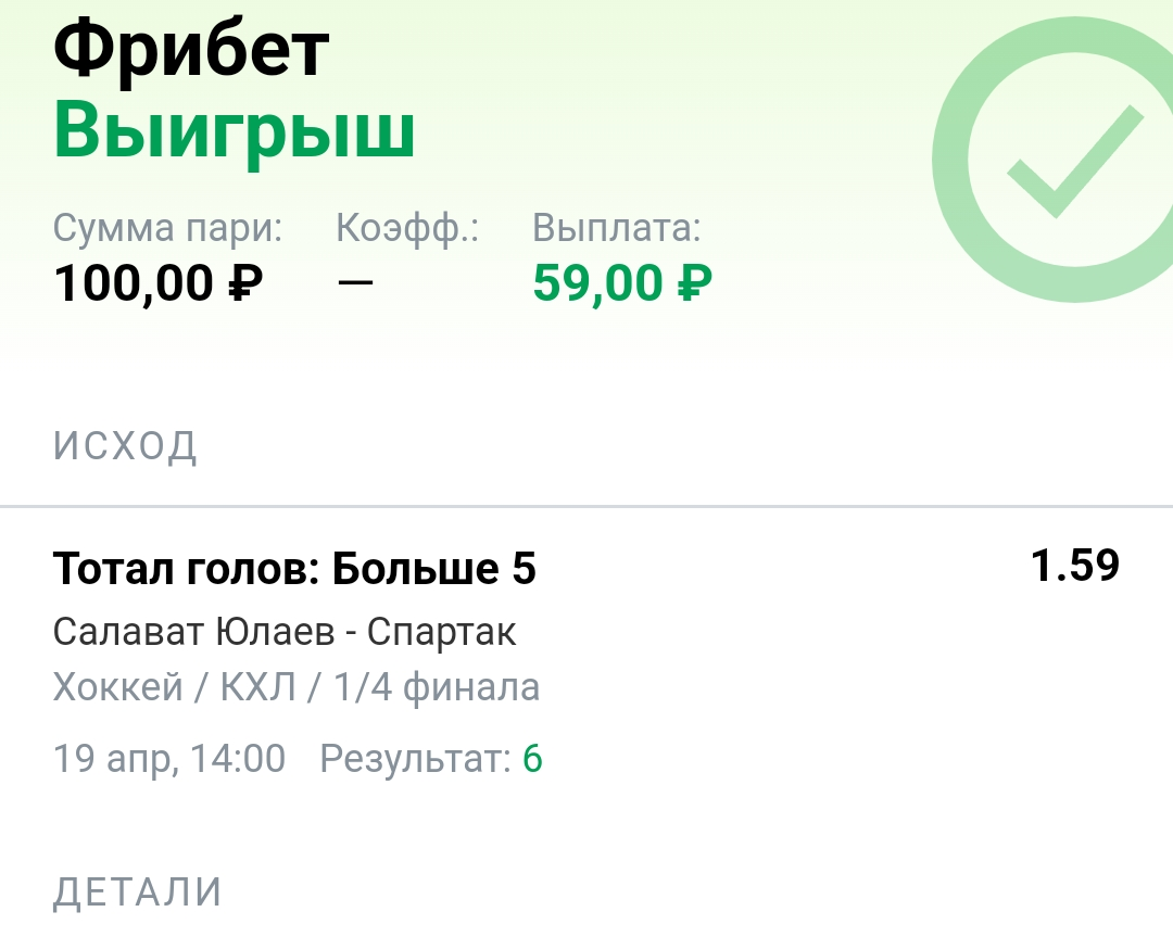 Наша ставка на фрибет 100 рублей с коэффициентом 1,59 выиграла, и на счет была зачислена сумма чистого выигрыша 59 рублей.