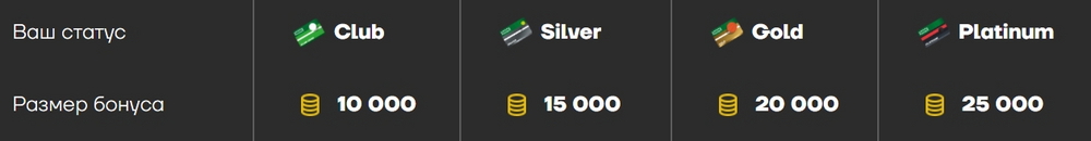 В букмекерской компании «Лига Ставок» есть четыре VIP-статуса: «Club», «Silver», «Gold» и «Platinum». Чем престижней статус, тем крупнее номинал бонуса в промо «Побеждайте вместе».
