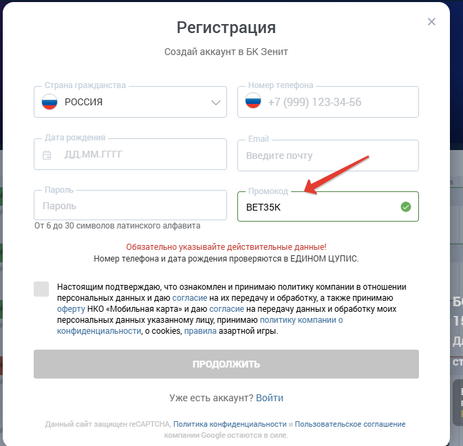 - Пройти регистрацию в БК «Зенит»;