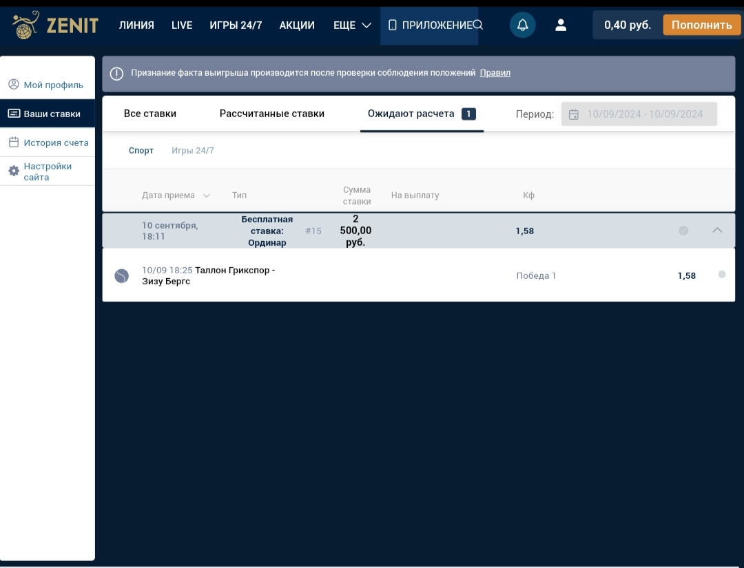 💡 Бонус в БК «Зенит» вас ни к чему не обязывает, вывод средств не блокируется. Если он вам не нужен, можно просто не выполнять условия отыгрыша, а делать ставки на своё усмотрение – бонус сгорит по истечении 30 суток с момента начисления либо при первом выводе средств.