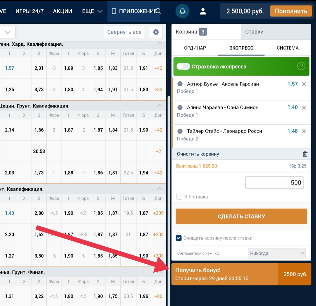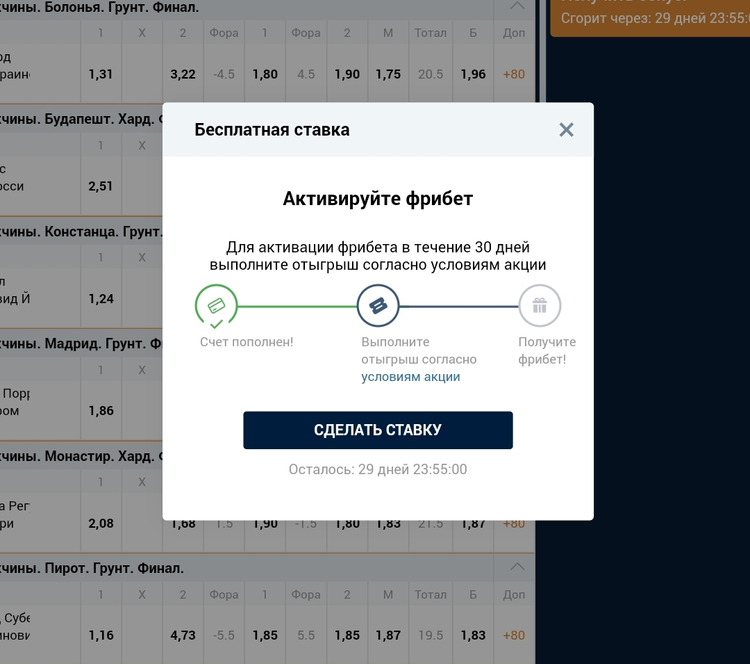 На отыгрыш даётся 30 суток с момента активации фрибета (пополнения счета). В нашем случае потребуется совершить ставок на общую сумму 12500 рублей (5 х 2500).