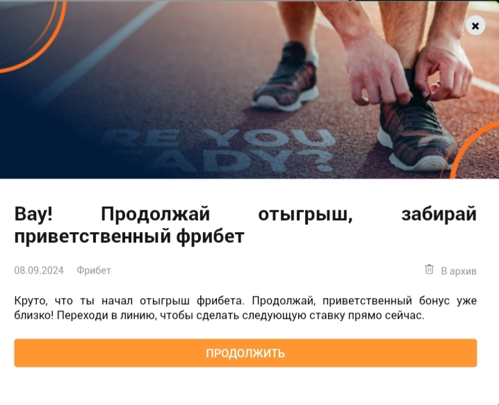 В уведомлении отображается сумма фрибета, который можно получить (размер фрибета равен сумме первого депозита), и указан период, по завершению которого фрибет сгорит.