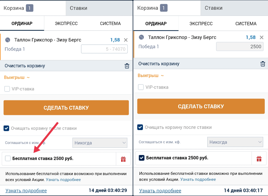 Как только правила отыгрыша будут выполнены, фрибет становится доступен для ставок. Его можно найти в купоне, при оформлении ставки. Чтобы его использовать, просто выбираем в купоне фрибет (ставим галочку) и заключаем пари.