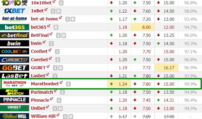 Букмекерская контора «Марафон» обнуляет маржу на многие спортивные события. Благодаря этому, компания предлагает одни из лучших коэффициентов на рынке (на акционные матчи).