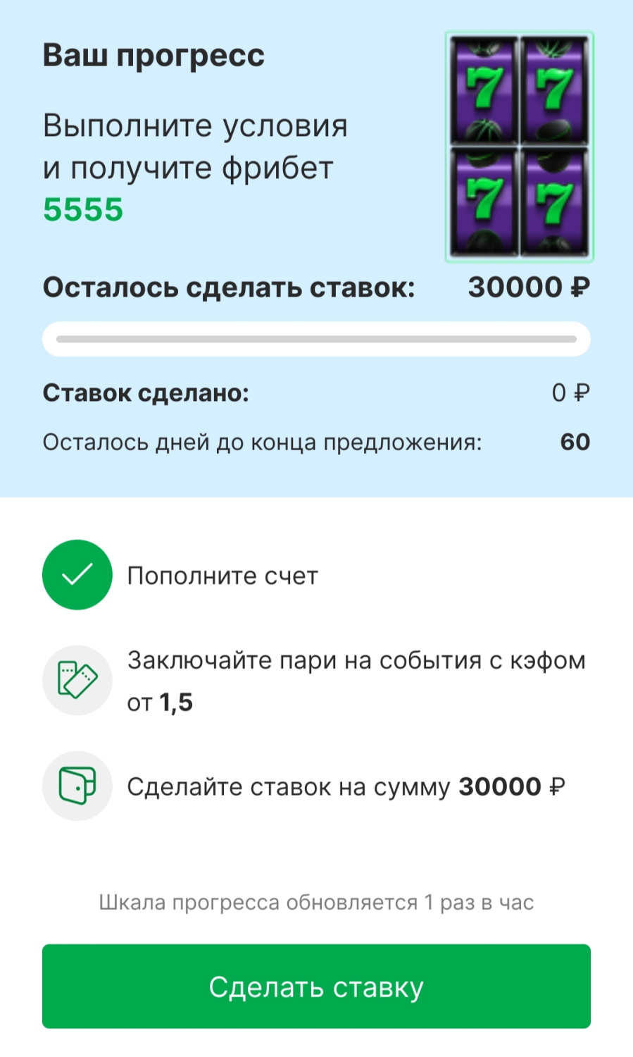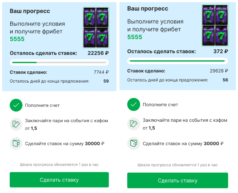 По мере выполнения условий можно отслеживать свой прогресс на странице фрибета.