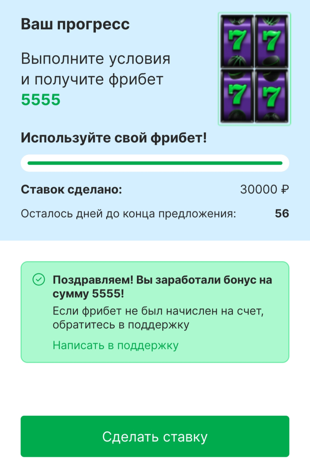 Как только необходимый оборот будет выполнен, на странице фрибета появится поздравление с его получением.