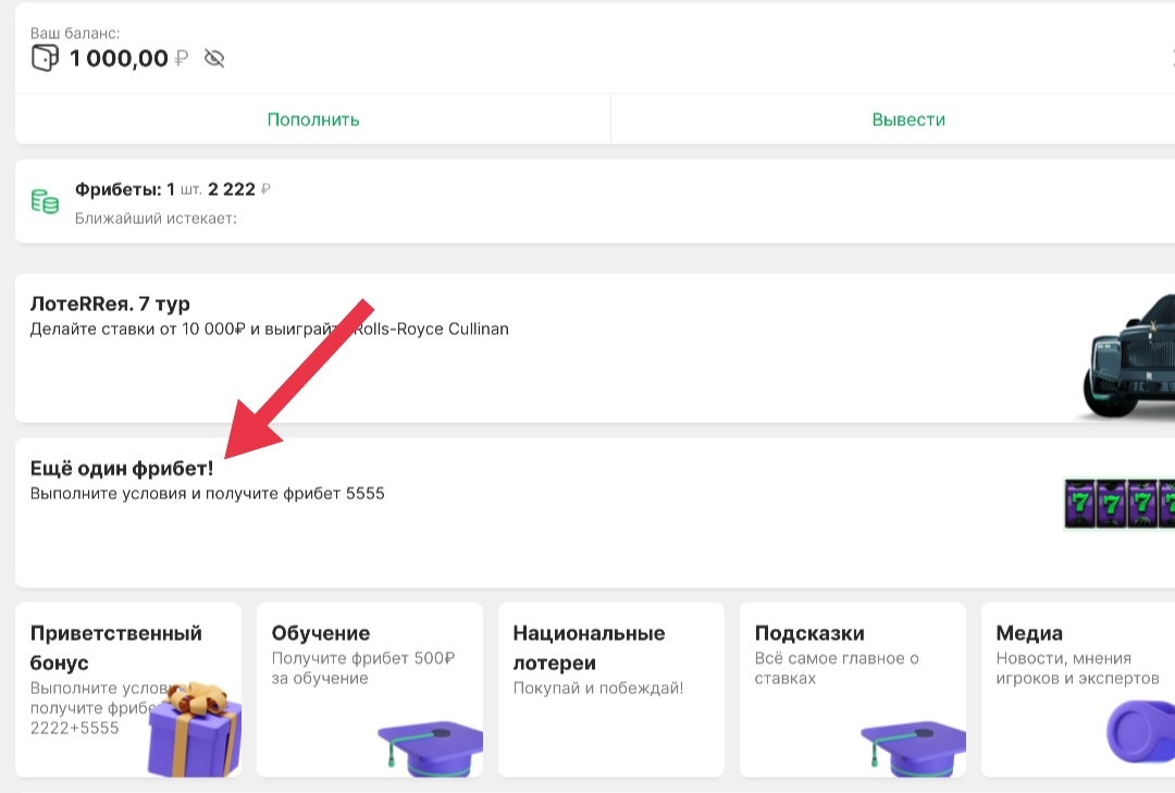 После начисления первого фрибета появится баннер «Ещё один фрибет». При переходе по ссылке откроется страница с информацией по получению второго фрибета.