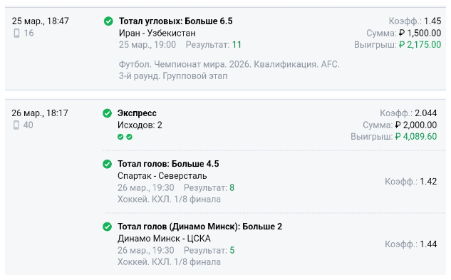 - Любой тип исхода (в режимах live и прематч) для ординаров или экспрессов;
