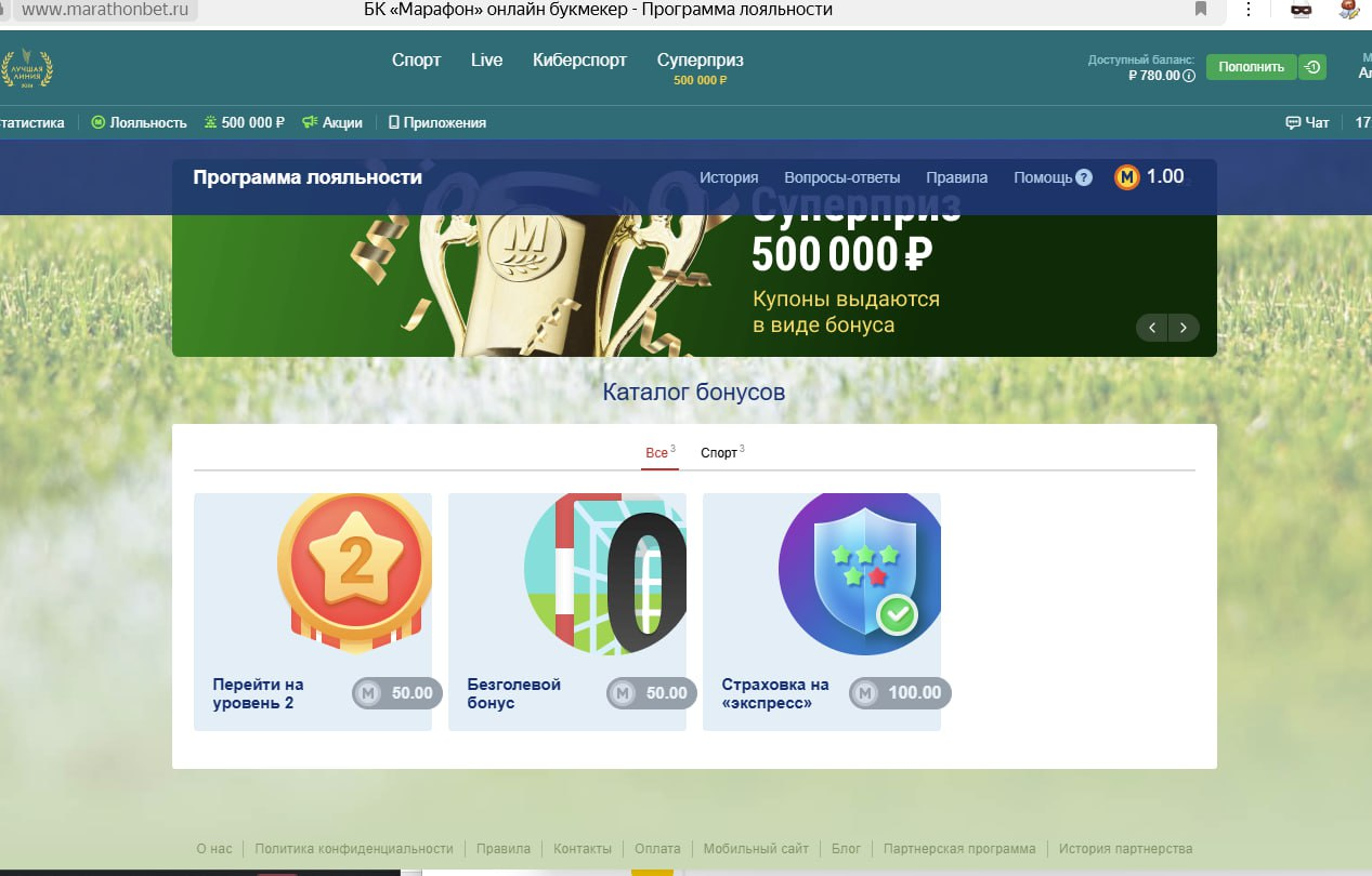 Программа лояльности от БК «Марафон» – предложение для всех клиентов букмекера, в котором поощряется игровая активность. Очки можно накапливать на ставках с широким диапазоном по условиям (невысокий коэффициент, любые исходы), а затем обменивать их на бонусы или же продвигаться по системе уровней.