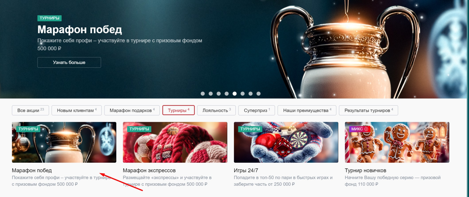 Букмекерская компания «Марафон» проводит акцию «Марафон побед». Турнир с призовым фондом 500 000 рублей проводится каждую неделю и даёт шанс попасть в число 500 лучших участников, чтобы получить фрибет. Главный приз акции – бонусная ставка на сумму 30 000 рублей.