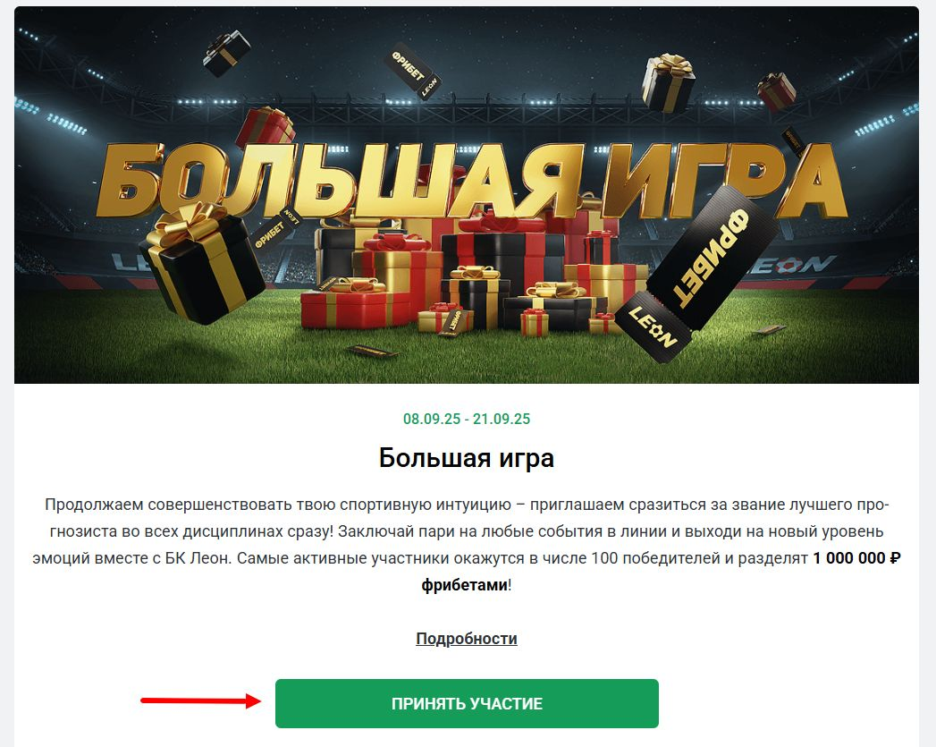 Букмекерская контора «Леон» проводит масштабную акцию «Большая игра» с общим призовым фондом 1 000 000 рублей. Сто самых активных участников разделят фрибеты, которые будут начисляться в зависимости от занятого места в итоговом рейтинге.