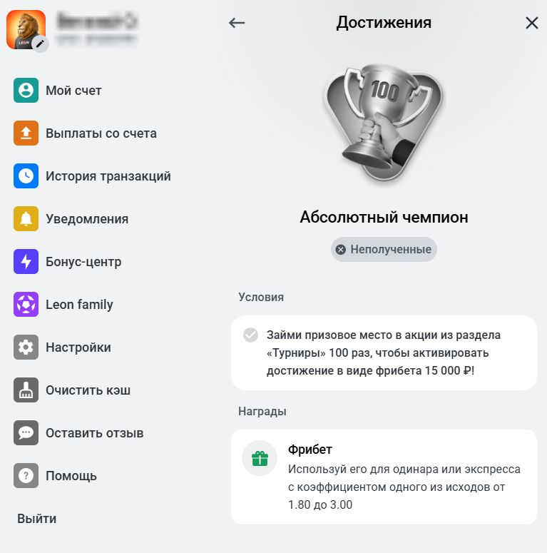 - Абсолютный чемпион – за участие в турнирах: займите призовое место 100 раз, чтобы активировать достижение. Награда – фрибет 15 000 рублей, который можно использовать для одинара или экспресса с коэффициентом от 1.80 до 3.00.