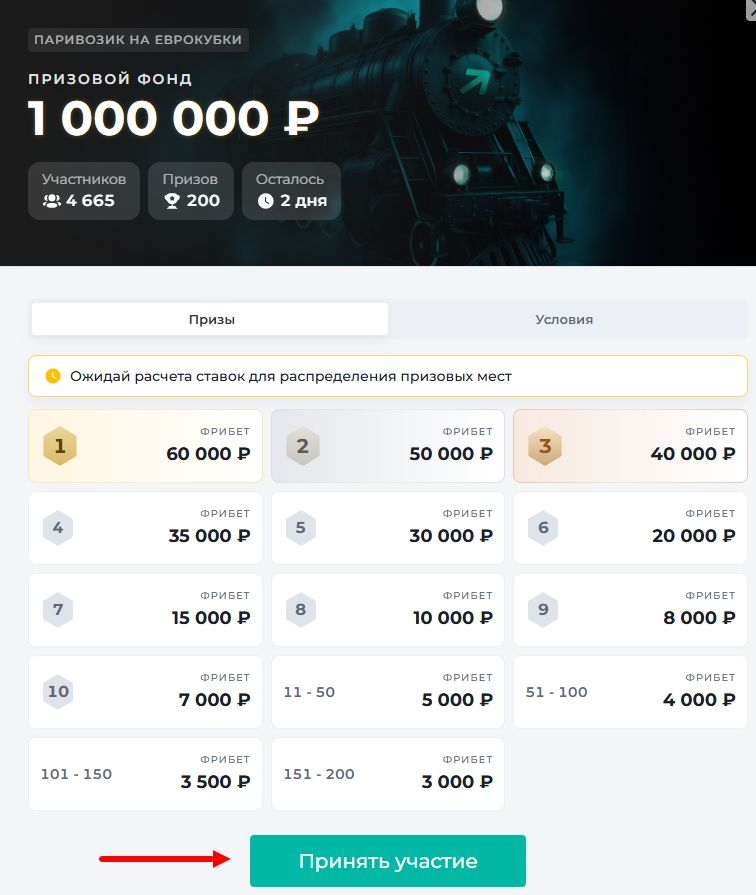 Букмекерская контора PARI проводит акцию для поклонников европейского футбола. Призовой фонд составляет 1 000 000 рублей, который будет распределён среди 200 участников. Фрибеты номиналом от 3000 до 60 000 рублей получат игроки, занявшие верхние позиции в турнирной таблице.