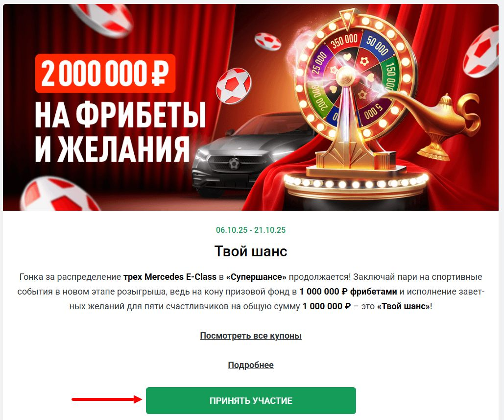 Каждая ставка, отвечающая условиям, приносит 1 купон. Чем больше купонов – тем выше шанс на победу. Когда пользователь набирает 100 купонов, он получает 1 билет в финальный розыгрыш, где разыграют три автомобиля Mercedes E-Class.