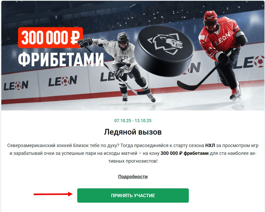 В букмекерской компании «Леон» проходит акция «Ледяной вызов», приуроченная к началу сезона НХЛ. Принять участие могут все любители хоккея, которые заключают пари на матчи с минимальным коэффициентом от 1.50. На кону – 300 000 рублей фрибетами, которые будут распределены между 100 активнейшими участниками.