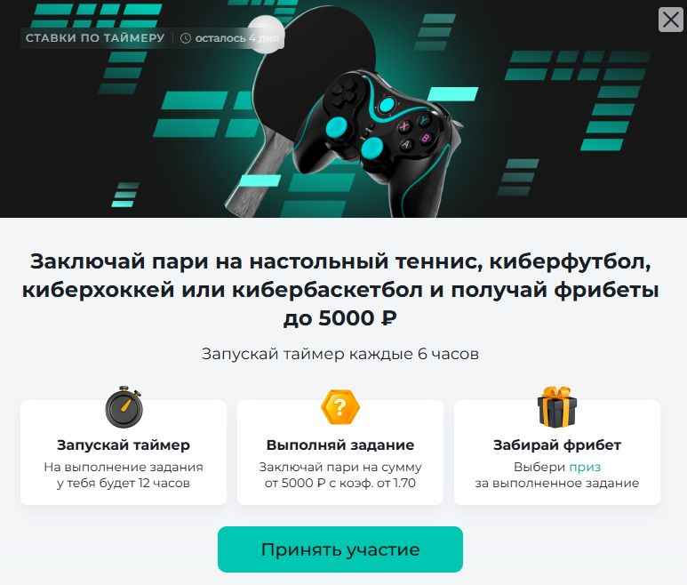 - Оформить экспресс-пари на сумму от 5000 рублей с коэффициентом от 1.70 в течение 12 часов после запуска таймера. События должны быть из разделов настольный теннис, киберфутбол, киберхоккей и кибербаскетбол.
