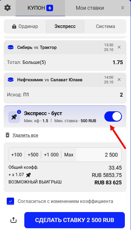 - Активировать акцию «Экспресс-буст» в купоне перед оформлением ставки.