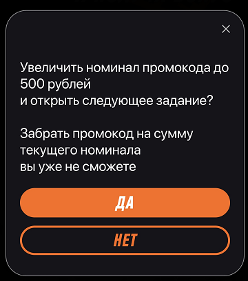 - В любой момент (до открытия следующего задания) можно остановиться и забрать промокод.