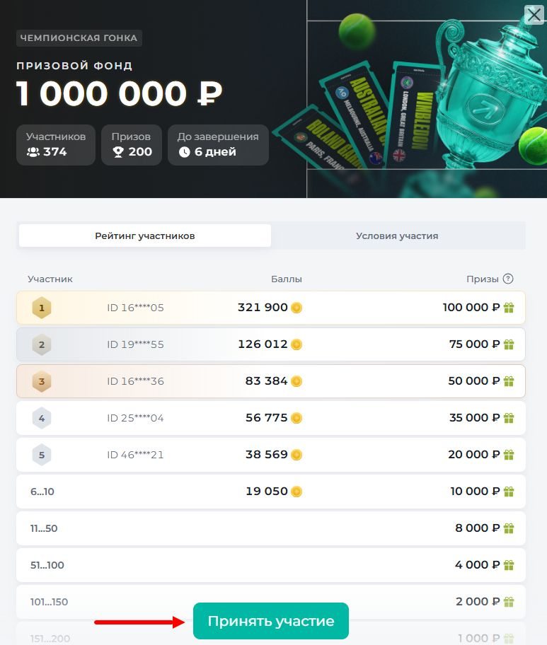Для того чтобы попасть в топ-200, необходимо накапливать как можно больше баллов, ставя на более высокие коэффициенты и увеличивая сумму ставок. Общий призовой фонд акции составляет 1 000 000 рублей, который будет распределен между 200 самыми активными участниками следующим образом: