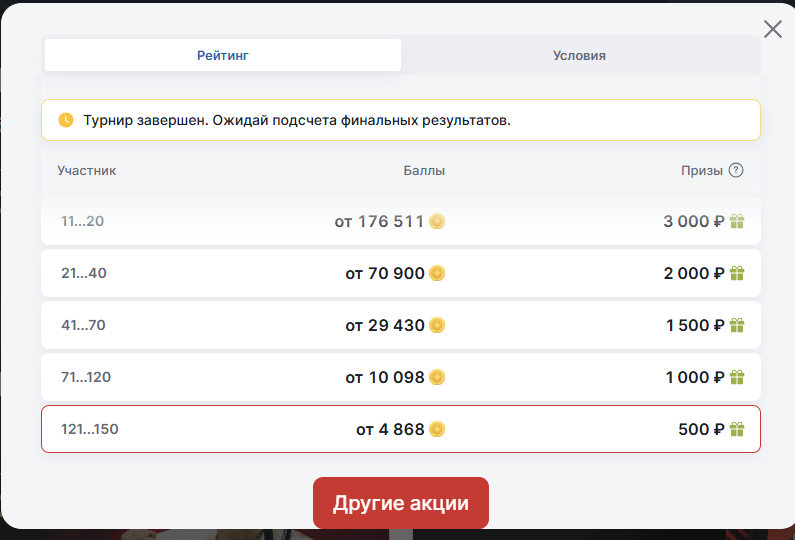 Пример с результатами одного турнира можно видеть на скриншоте ниже. Как видно для получения 500 рублей достаточно было набрать 4868 баллов, для 1000 рублей — 10 098 баллов.
