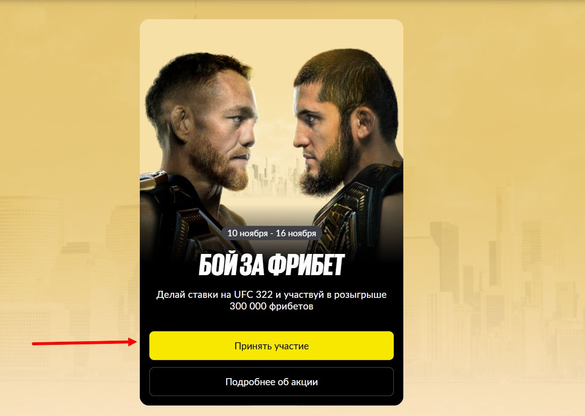 - Перейти на страницу акции «Бой за фрибет», нажать кнопку «Принять участие».