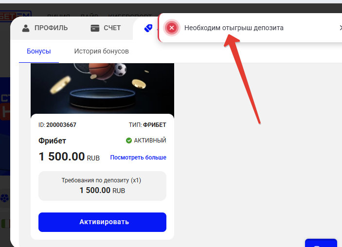 Бонус появится после внесения депозита (в нашем примере — 1500 рублей). Активировать фрибет сразу нельзя — система уведомит о необходимости отыгрыша.