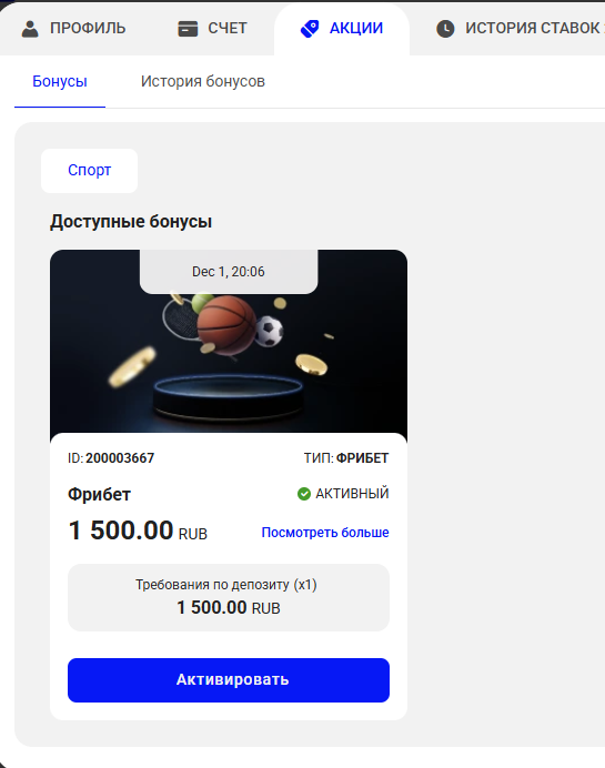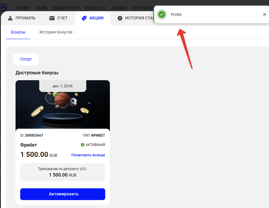 - Активировать фрибет после расчета ставки в личном кабинете.
