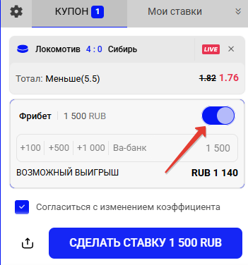 Нужно выбрать подходящее событие, добавить исход в купон и затем включить тумблер фрибета в купоне.