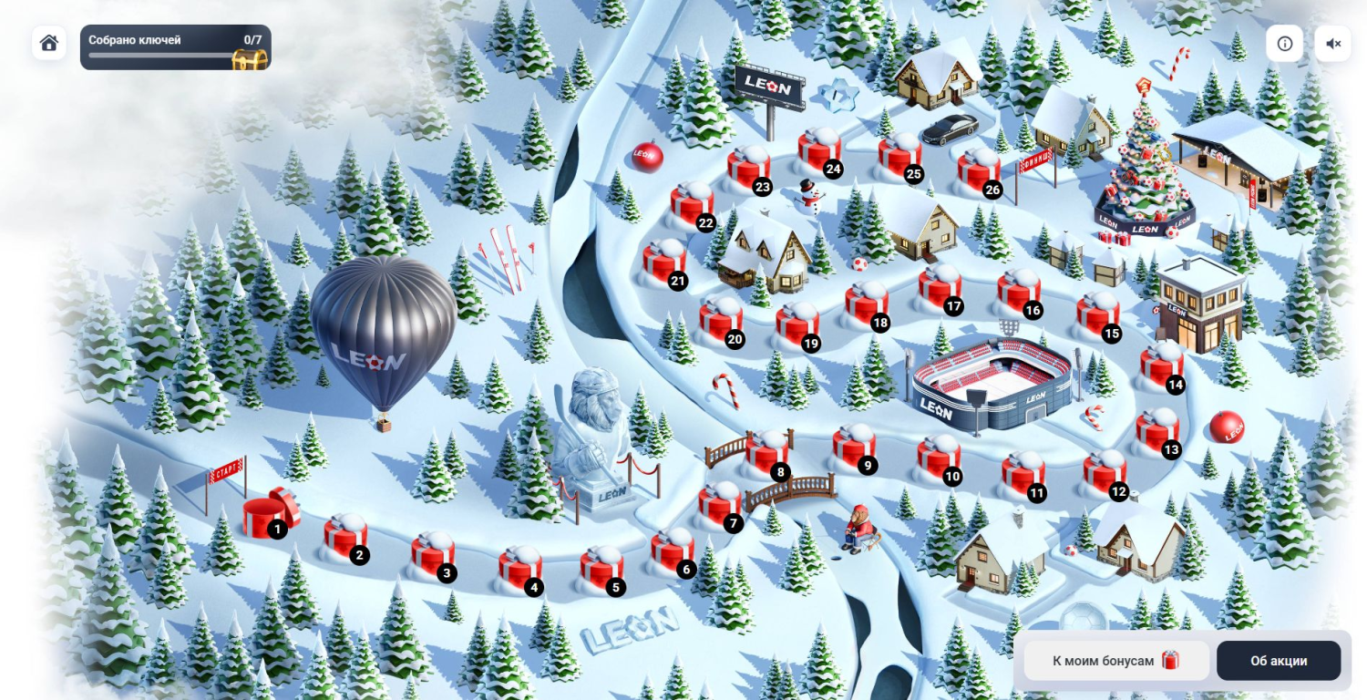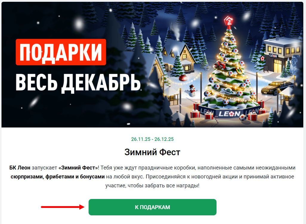 В преддверии Нового года букмекерская компания «Леон» проводит праздничную акцию «Зимний фест». В течение всего декабря игроки смогут ежедневно открывать боксы с подарками, внутри которых находятся фрибеты, бонусы на депозит, страховки ставок и специальные ключи для получения дополнительного секретного приза. Акция доступна всем зарегистрированным игрокам и не требует сложных условий для старта — достаточно заходить каждый день и забирать свой подарок.