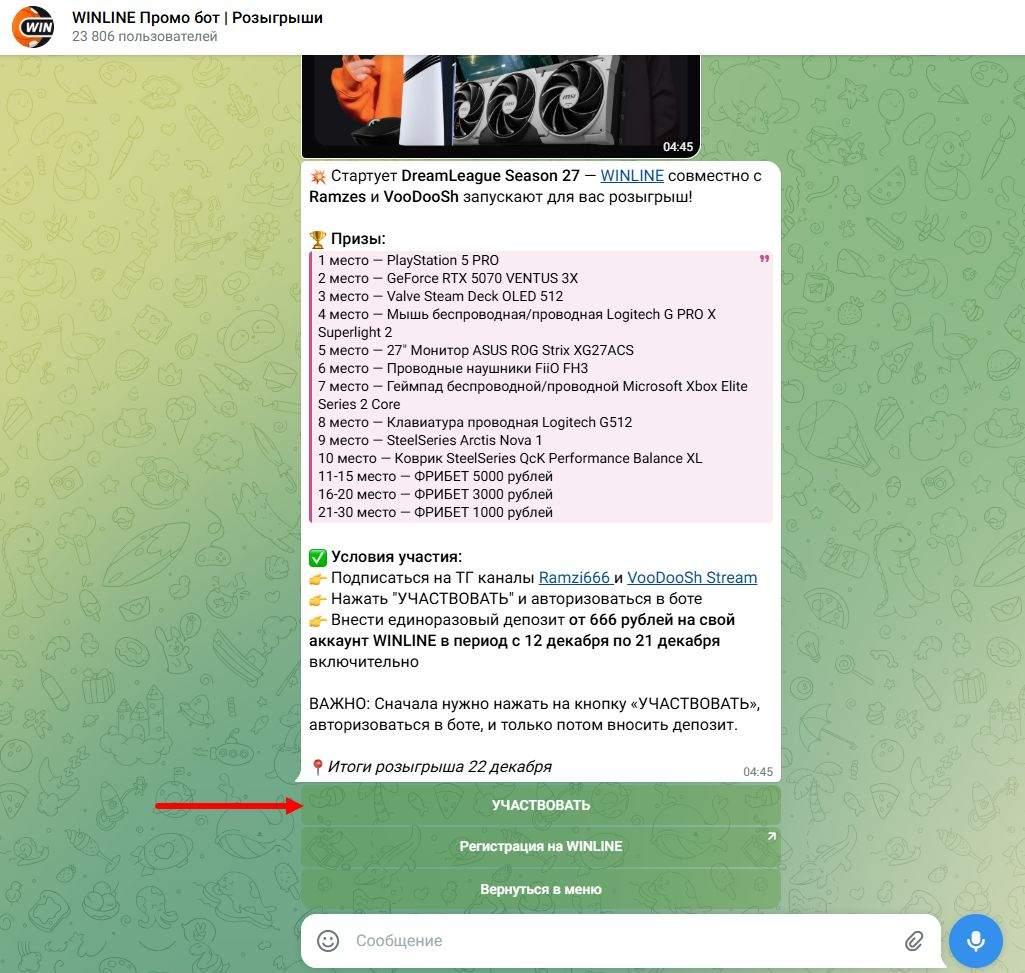 !! Важно: депозит необходимо вносить только после нажатия кнопки «УЧАСТВОВАТЬ» и успешной авторизации в боте. В противном случае участие в розыгрыше засчитано не будет.