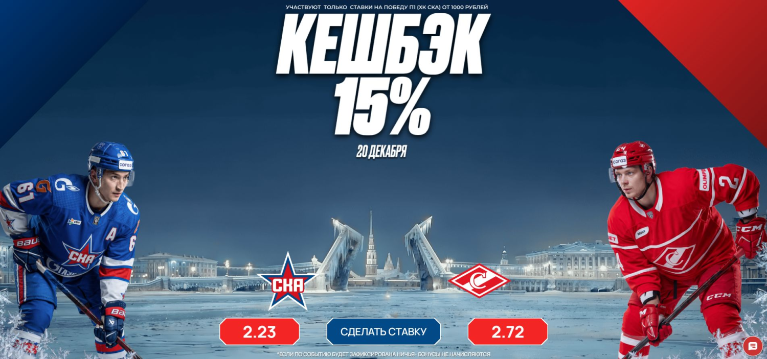 «Олимпбет» предлагает страховку для ставок на центральный матч игрового дня КХЛ между СКА и «Спартаком» (начало — 20 декабря, 17:00 мск). В рамках специальной акции игроки могут застраховать пари на победу петербургского клуба и получить часть потраченных средств обратно в виде фрибета, если прогноз не зайдёт.